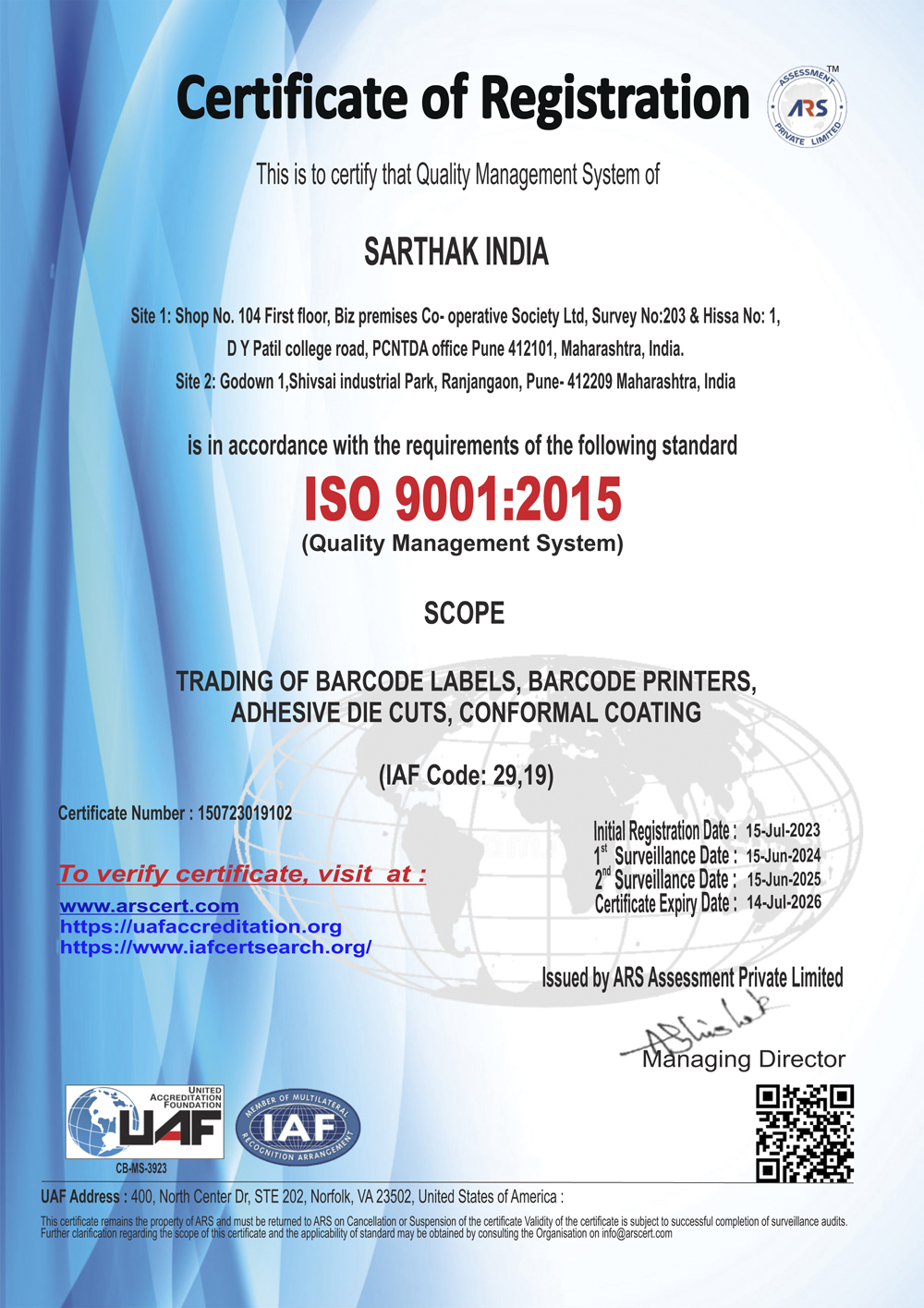 Set up in 2016 Sarthak India is a growing organisation offering performance effective Solutions in High performance Barcode labels, Security/Void Labels, Barcode Printer& Scanners with traceability Software,Customized Traceability solutions, Visual Safety Communication, Thermal Gap Pads & Speciality die cuts to our Valued Customers in Automotive & Electronics Manufacturing Systems Sector.